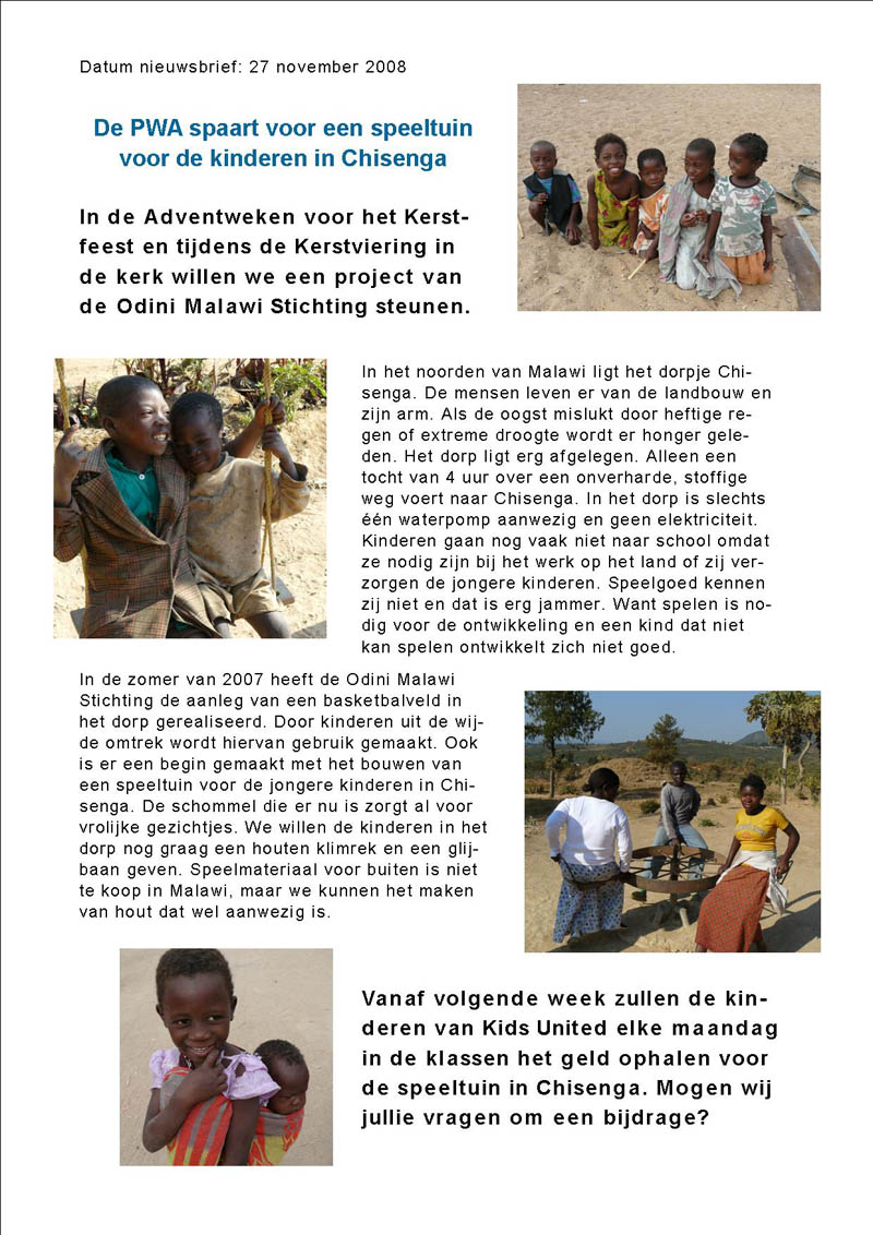 Op de Kerstviering van 17 december 2008 in de Barbarakerk werd een collecte gehouden voor de Odini Malawi Stichting. De opbrengst was verrassend: € 785,- voor het kinderspeelplaatsproject. Alle gevers worden hartelijk bedankt.