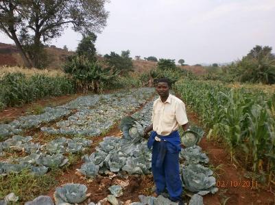 Eén van de boeren bij een stuk land waar gewassen worden verbouwd om weeskinderen en arme mensen te helpen.